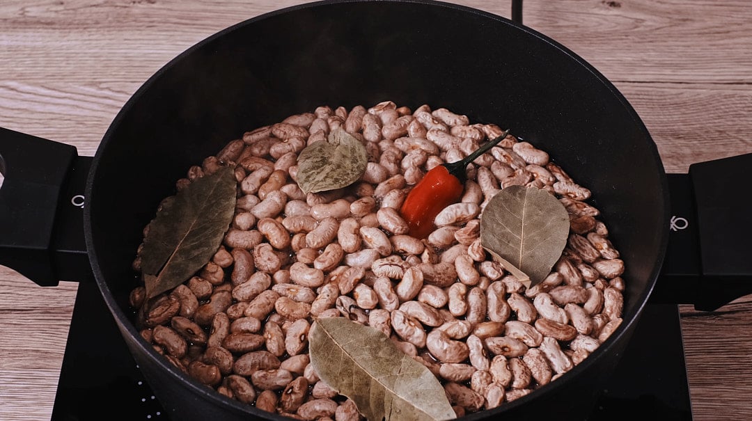 Simmer the beans. In a pot, combine 8 cups water, beans, bay leaves, and a whole chili pepper. Simmer over medium-low until beans are tender, about 2 hours.