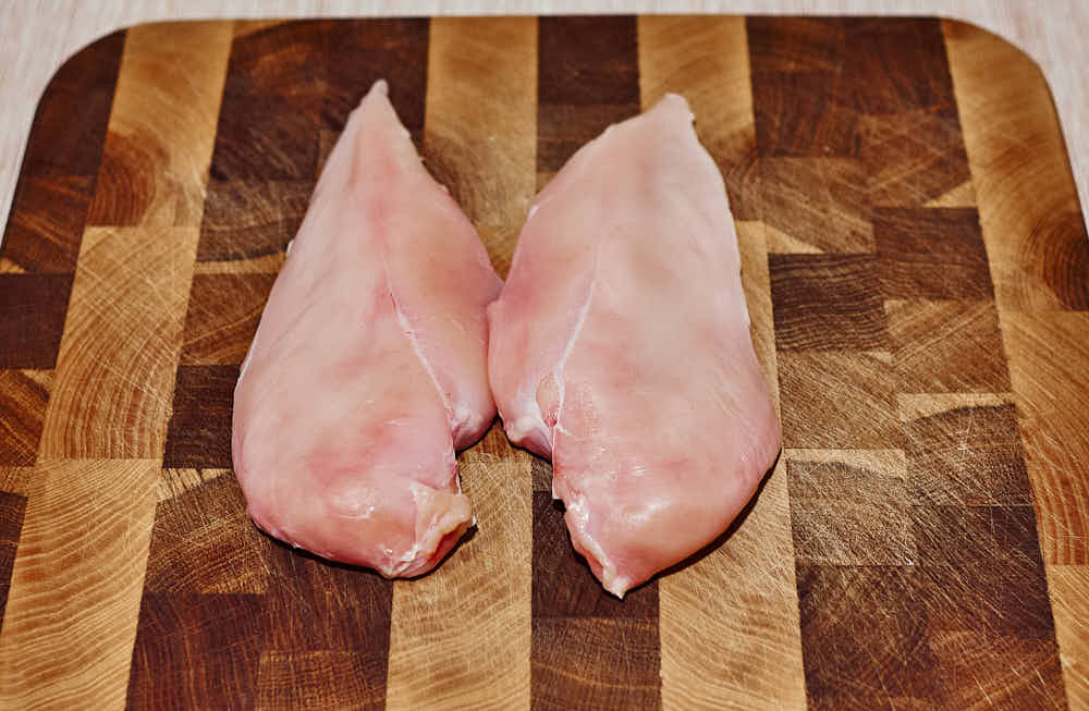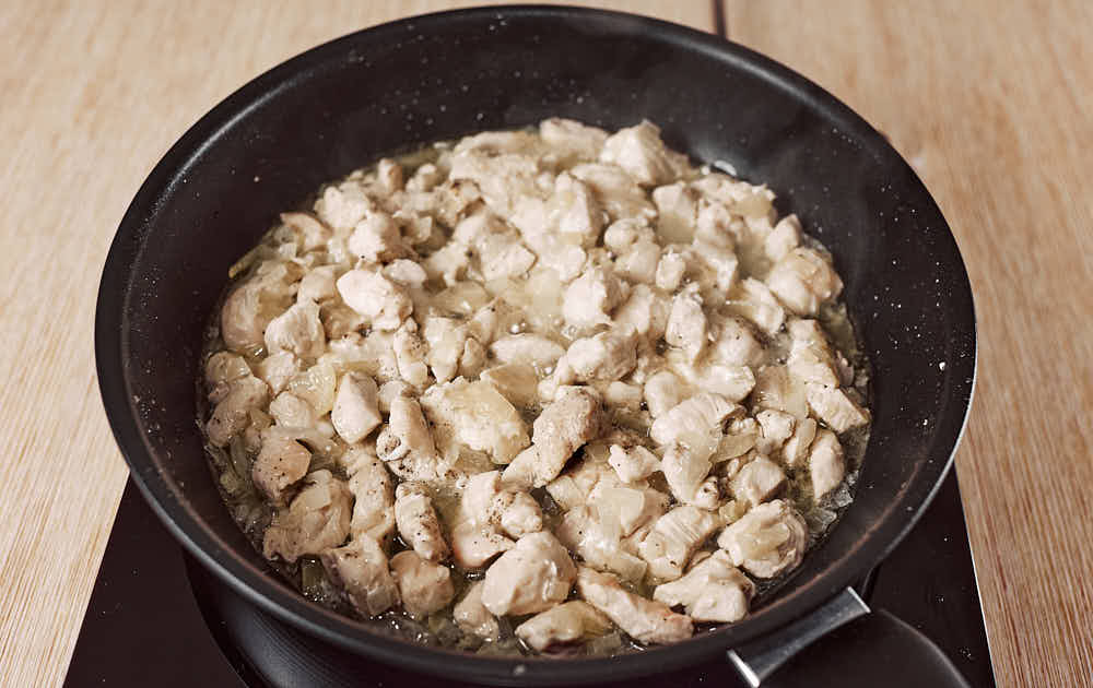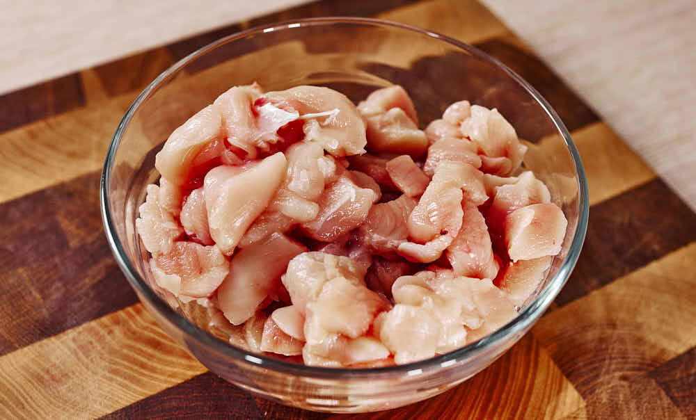 Wash and dry about 1 lb. (400 gr.) chicken breast, cut the chicken breast into strips, and then into small pieces (this will cook faster and more evenly).