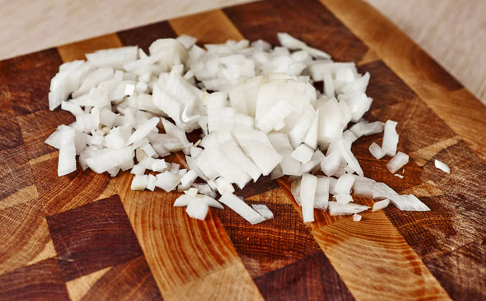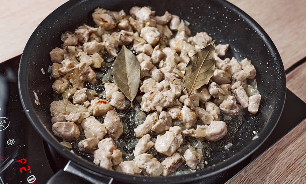 Add finely chopped onions to the skillet. Cook for 6 minutes, stirring constantly, over low heat. Then add the pieces of meat on top of the onions. Add salt and freshly ground pepper, cook for 10 minutes, stirring constantly over medium heat.
