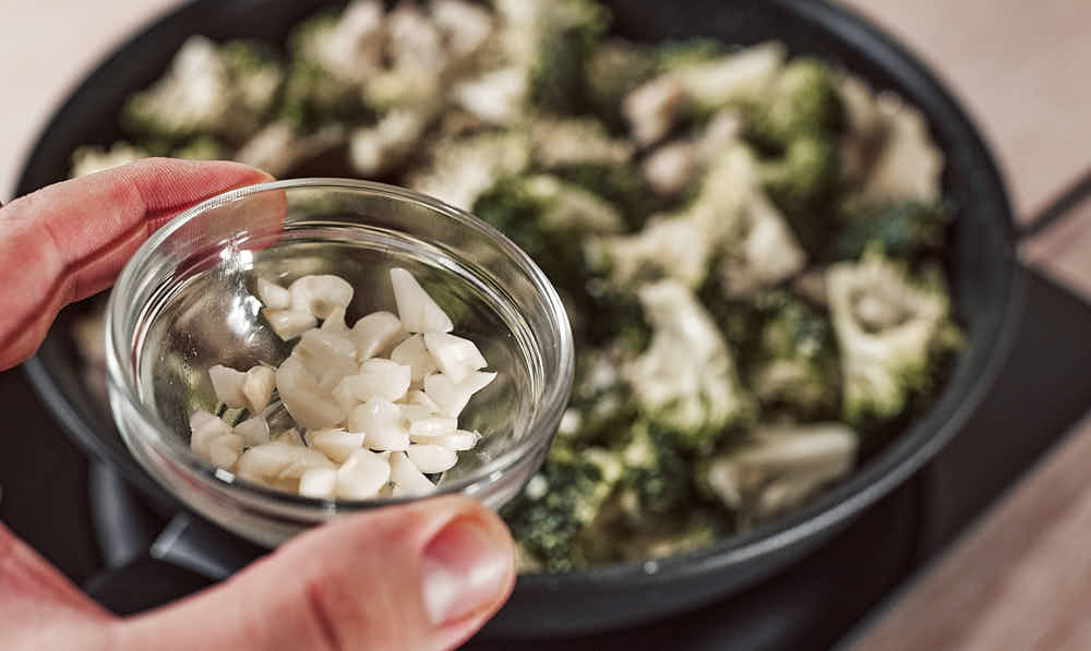 Add 2 bay leaves to the skillet, chopped broccoli, salt, freshly ground pepper, oregano and finely chopped garlic.