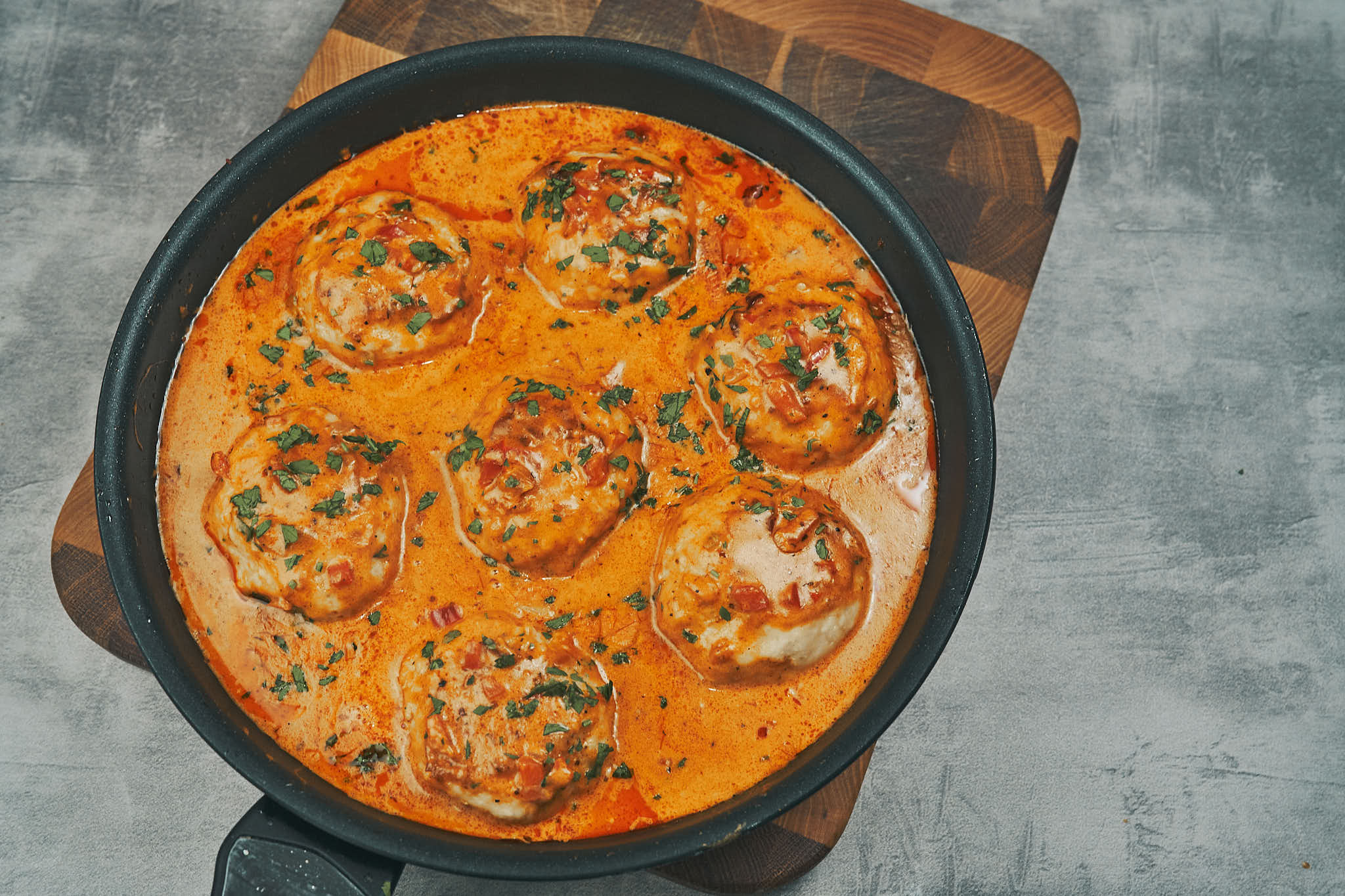 Form large chicken meatballs and lightly coat them in flour. Gently place the meatballs into the sauce.