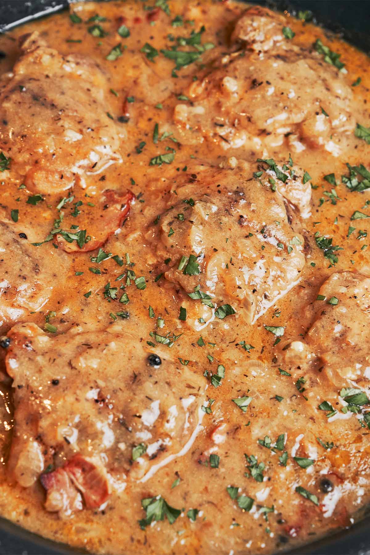 Golden-seared chicken thighs are gently simmered in a flavorful sauce with crispy bacon, caramelized onions, garlic, Dijon mustard, and herbs. The result is a rich, savory gravy that’s perfect for serving over rice, mashed potatoes, or with crusty bread to soak up every drop.
