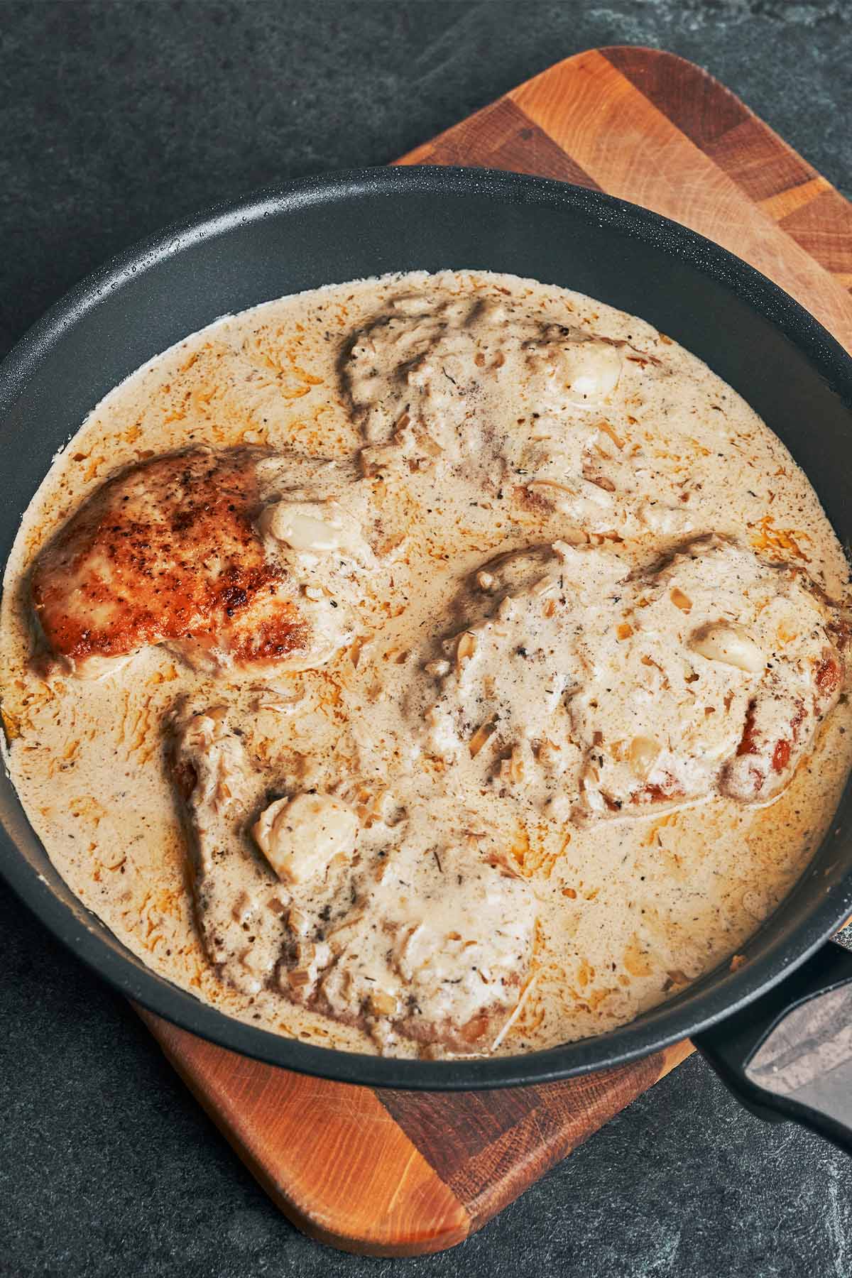 Bring it all together. Return the chicken to the skillet and let it simmer in the sauce for a few minutes, until the chicken is warmed through and coated in the creamy garlic sauce.