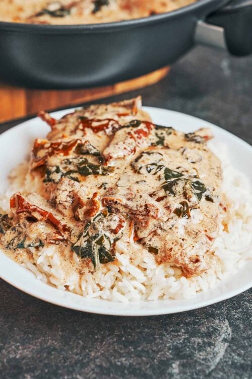 Serve this creamy Tuscan chicken over fluffy rice or creamy mashed potatoes to soak up every last bit of the creamy sauce.