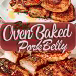 Juicy, tender, and full of flavor — This slow roasted pork belly recipe makes for the perfect dinner. Perfectly oven roasted pork belly with tender, succulent meat. With just 6 ingredients it’s so easy to make.